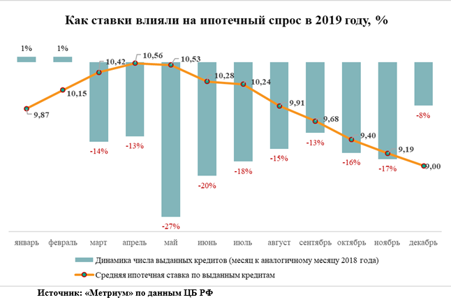 Во втором полугодии каждый месяц число ипотечных сделок снижалось примерно на 10-30% относительно аналогичных месяцев 2018 года, и это при том, что в то же время ставки последовательно снижались с 10,3% до 9%.