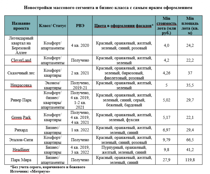 Из 238 новостроек массового сегмента и бизнес-класса аналитики «Метриум» смогли выделить только 10 проектов, в оформлении которых встречаются 4 и более цвета, отличных от «большой» тройки. Самым доступным из них оказался апартаментный комплекс «Легендарный квартал на Березовой Аллее», цены в котором стартуют от 4 млн рублей. Одной из фишек проекта являются огромные граффити с изображением спортсменов на торцах зданий. В них использовано большое количество ярких цветов, которые и задают настроение всему комплексу.