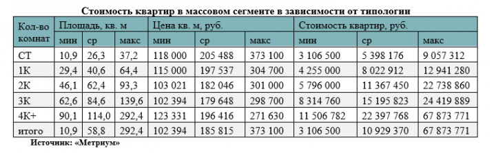 Средние бюджеты предложения выросли по всем типологиям (максимальный рост отмечен на студии – 8,1% и многокомнатные лоты – 9,2%). Прирост по рынку в целом составил 7,8%, таким образом средняя стоимость квартиры в массовом сегменте достигла 10,9 млн руб. (в конце 2019 года – 10,1 млн руб.).