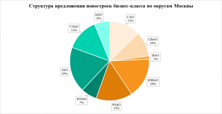 С начала года география предложения московских новостроек бизнес-класса заметно изменилась, отметили эксперты «Метриум». Почти в два раза выросло число квартир в ЮВАО, тогда как в округах, традиционно считающихся «престижными» (СЗАО, ЗАО, ЮЗАО и ЦАО), выбор у покупателя резко сократился, и их доля составила 45%, хотя в начале года она превышала 50%.