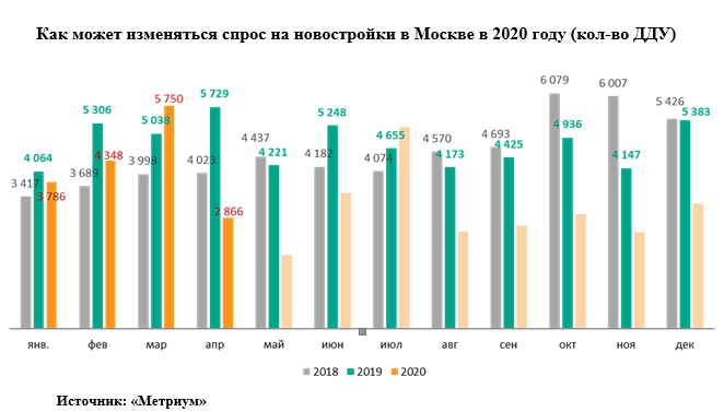 По оценкам экспертов «Метриум», спрос на жилье в Москве по итогам 2020 года может снизиться на 20-30%. Летом после снятия ограничений произойдет всплеск числа сделок, которые будут заключать клиенты, не успевшие это сделать до самоизоляции. Однако уже осенью восстановительный рост иссякнет, эконмическая ситуация ухудшится (станет ясно, сколько предпринимателей не «пережили» пандемию).