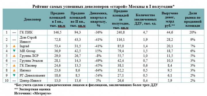 На долю десяти лидирующих по продажам столичных застройщиков пришлось 60% от общего числа реализованных в I полугодии площадей в новостройках «старой» Москвы, подсчитали эксперты «Метриум». В этот период им удалось найти покупателей для жилья общей площадью 743 тыс. кв.м в, а выручка от продажи квартир и апартаментов достигла 163  млрд рублей. Однако из-за режима самоизоляции и ухудшения ситуации в экономике во II квартале выручка топовых московских застройщиков снизилась на 20%.