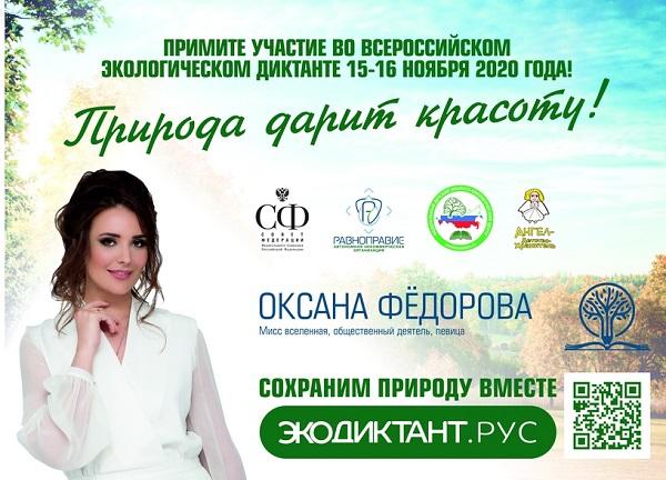 Всероссийский экологический диктант пройдет 15 и 16 ноября на организованных оффлайн-площадках и онлайн-портале Экодиктант.рус. Свои экологические знания проверят школьники и студенты, представители федеральных и региональных органов власти, сотрудники крупнейших корпораций – всего свыше двух миллионов человек. Участие в Экодиктанте осуществляется на добровольной и безвозмездной основе. Все получат сертификаты, а победители – почётные грамоты и призы.