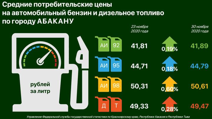 Корреспондент 19rus.info познакомился с данными Красноярскстата и выяснил, что АИ-92 вырос на 0,19%; АИ-95 - на 0,18; АИ-98 - на 0,6; дизельное топливо - на 0,28%. Подробнее об изменениях, в ценах вы можете увидеть в таблице ниже.