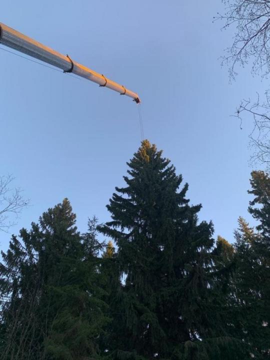 После того, как елка будет уложена, она отправится на временную стоянку и уже оттуда ночью ее повезут на Дворцовую площадь. почти 12 тонн. Работа в лесу Всеволожского района началась в семь утра.