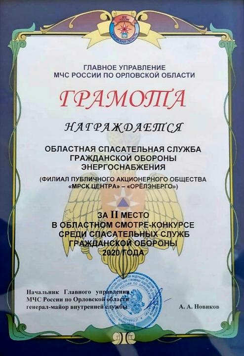 В Орловской области были подведены итоги работы по обеспечению безопасности в 2020 году. В рамках ежегодного учебно-методического сбора глава региона Евгений Клычков в торжественной обстановке наградил должностных лиц гражданской обороны и Орловской областной территориальной подсистемы РСЧС за добросовестный труд и победу в смотре-конкурсе служб ГО. Лауреатам вручили переходящие кубки и грамоты. В мероприятии приняли участие сотрудники «Россети Центр Орелэнерго» - и.о. заместителя генерального директора – директора филиала Сергей Алёшин и начальник отдела по мобилизационной подготовке, гражданской обороне и чрезвычайным ситуациям Александр Филиппов.Областная спасательная служба гражданской обороны энергоснабжения, созданная на базе Орелэнерго, заняла почётное II место в смотре-конкурсе служб ГО 2020 года, уступив пальму первенства медикам. В рамках мероприятия губернатор Орловской области Андрей Клычков объявил благодарность руководителю филиала Сергею Алёшину за большой вклад организации в выполнение задач в сфере гражданской обороны, защиты населения и территорий от чрезвычайных ситуаций. А начальнику отдела по мобилизационной подготовке, ГО и ЧС Александру Филиппову были вручены Почётные грамоты Орловского областного Совета народных депутатов и Главного управления МЧС России по Орловской области.