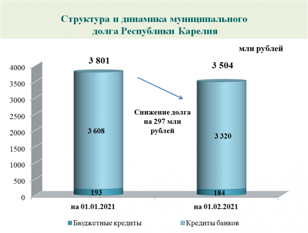 Общий долг муниципалитетов Карелии на 1 февраля 2021 года составил 3,504 млрд рублей и снизился по сравнению с началом года на 297 млн рублей, или на 8%, сообщает пресс-служба Минфина.