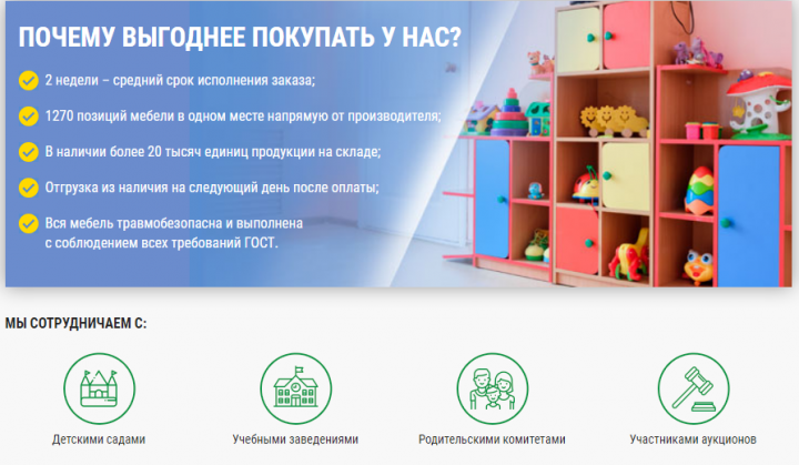 Мы работаем с детсадами, образовательными учреждениями, родительскими комитетами, строительными компаниями, магазинами розничной торговли, изготовителями мебели, инет-магазинами, участниками аукционов.