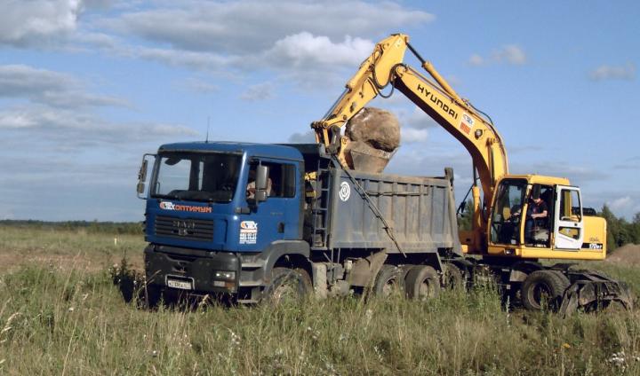 Демонтаж зданий и сооружений-компания Техоптимум. Самосвал MAN TGA 33.360 и экскаватор Hyundai r 170 w-7 компании Техоптимум. Разработка котлована и вывоз грунта. Благоустройство территории. http://www.tehoptimum.ru