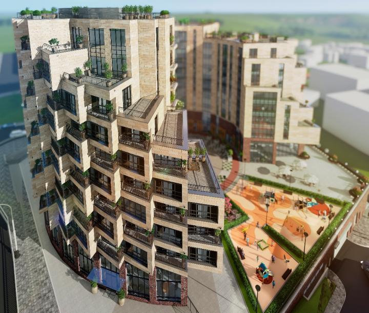 Ступенчатая архитектура и смещение этажей относительно друг друга создают яркий, запоминающийся образ. Современный фасад новостройки сформирован динамично выступающими угловыми объемами. Для отделки будут использованы иранский гранит и светлый травертин. Резидентов встретят роскошные входные группы с потолками 7 метров и дорогой дизайнерской отделкой.