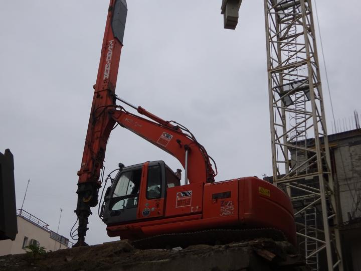 Компания Техоптимум-земляные работы.Гусеничный экскаватор Hitachi ZX225 USRLC с телескопической рукоятью и грейферным ковшом компании Техоптимум.Разработка котлована и вывоз грунта.Снос и демонтаж зданий и сооружений.
