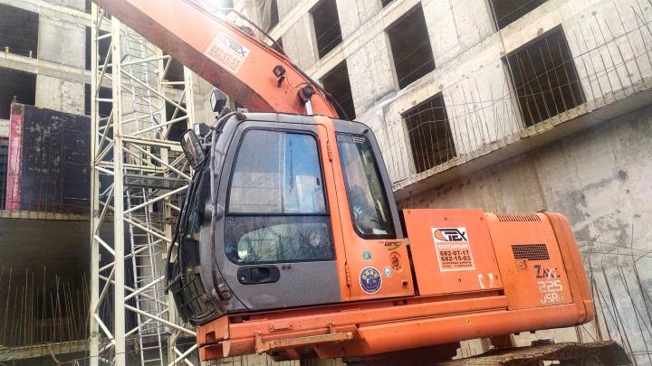 Компания Техоптимум-разработка котлована и вывоз грунта. Экскаватор Hitachi Zaxis 225USRLC с грейфером на телескопической рукояти компании Техоптимум.
