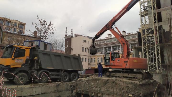 Компания Техоптимум-разработка котлована и вывоз грунта. Cамосвал RENAULT K 440 и экскаватор Hitachi Zaxis 225USRLC с грейфером на телескопической рукояти компании Техоптимум.