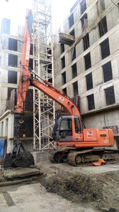 Компания Техоптимум-разработка котлована и вывоз грунта. Экскаватор Hitachi Zaxis 225USRLC с грейфером на телескопической рукояти компании Техоптимум.