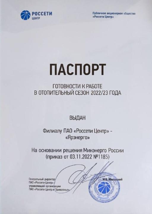 Филиал ПАО «Россети Центр» — «Ярэнерго» получил паспорт готовности в работе в отопительный сезон 2022/2023 годов. Все запланированные мероприятия, предусмотренные производственными программами филиала, выполнены в полном объеме.