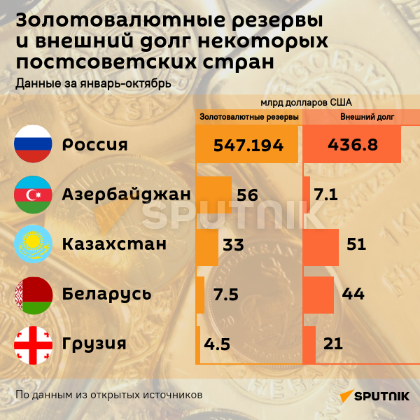 Международные резервы России на конец октября составили $547,1 млрд, а внешний долг - $436,8 млрд. Подробнее о соотношении валютных резервов и внешнего долга некоторых стран СНГ - в инфографике Sputnik Азербайджан. По итогам января-октября 2022 года валютные резервы Азербайджана составили $56 млрд, что почти в восемь раз превышает внешний долг страны в размере $7,1 млрд. В то же время золотовалютные резервы России на конец октября составили $547,1 млрд, а внешний долг - $436,8 млрд. Золотовалютные резервы Казахстана по итогам 10 месяцев 2022 года составили $33 млрд, а его внешний долг вырос до $51 млрд.