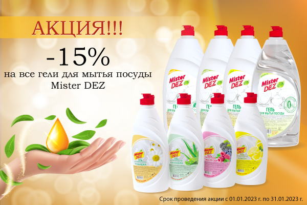 Условия акции: скидка 15% от базового прайса на все гели для посуды Mister DEZ.