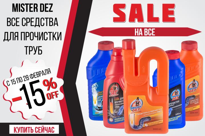 Условия акции: скидка 15 % от базового прайса на все средства для прочистки труб Mister DEZ