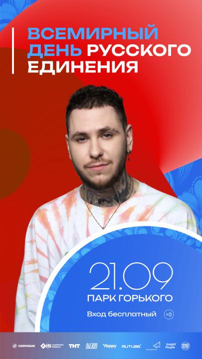 Концерт ко Всемирному дню русского единения — мероприятие, которое пройдет при поддержке партнеров - «Газпром-Медиа Холдинга», Газпромбанка, телеканала ТНТ, шоу «Вызов» на ТНТ, Yappy,  RUTUBE, компании «Иннопрактика», продюсерского центра Инсайт Люди, бойцовской лиги «Наше Дело», Молодежного сообщества ВЫЗОВ.