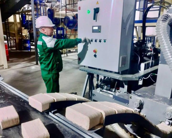 Отметим, новая линия брикетирования включена в технологическую цепочку пеллетного цеха и позволяет выпускать в зависимости от спроса топливные гранулы (пеллеты) или топливные брикеты. Сырьем для участка брикетирования служат сырые опилки, образующиеся в процессе лесопиления.