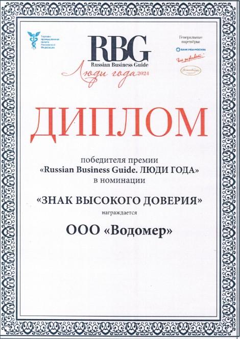 31 мая 2024 года в Конгресс-центре Торгово-промышленной палаты Российской Федерации прошла церемония вручения премии «Russian Business Guide. Люди года». Успехи мытищинской компании - производителя приборов учета воды и тепловой энергии ООО «Водомер» были отмечены дипломом лауреата премии в номинации «Знак высокого доверия».