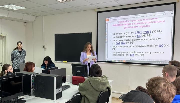 11 апреля 2025 года преподаватели кафедры лингвистики и межкультурной коммуникации факультета государственного и муниципального управления Маслова А.Д., Компанеева Л.Г., Барышникова Г.В. и Платонова Д.О., совместно с начальником управления информационной политики, организационно-массовой работы со студентами и абитуриентами Павловым П.В. провели мероприятие с целью профилактики кибербуллинга (т.е. травли в цифровом пространстве) в молодежной среде.