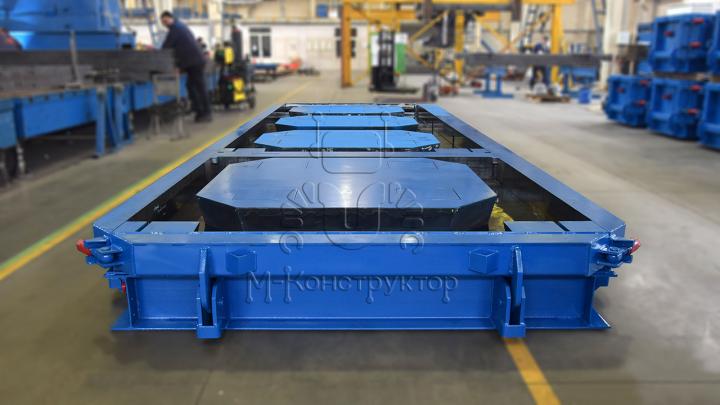 В основании силовая рама и установленные на нее откидные борта. Они подвижные и раскрываются при распалубке для извлечения изделия. Вышеназванные прямоугольники — съемные проемообразователи, выполненные с уклоном стенок, точная установка которых на формующую поверхность обеспечивается наличием конусов — посадочных мест. Из-за особенностей расположения ЖБИ в конструкции здания — а это чердачное пространство — форма имеет разную длину торцевых бортов, что сказывается на ширине изделия: их будет две.
