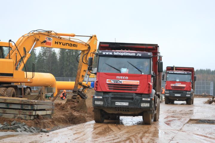 Компания Техоптимум-разработка котлована и вывоз грунта. Экскаватор Hyundai r 170 w-7 и самосвал IVECO TRAKKER 380 компании Техоптимум.