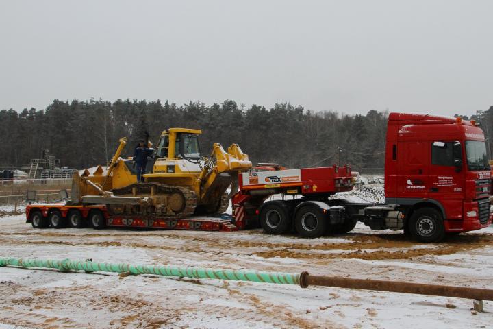 Перевозка спецтехники тралом-компания Техоптимум. Тягач DAF 105 и низкорамный полуприцеп Faymonville компании Техоптимум.