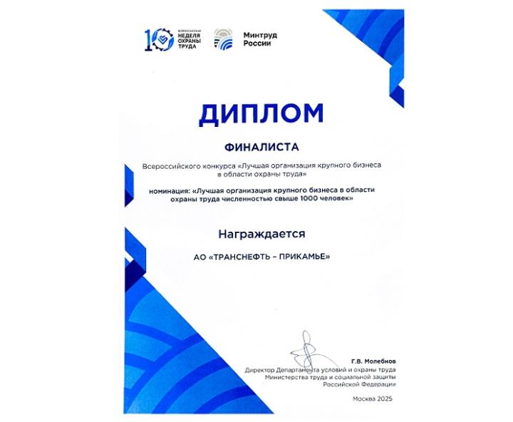 АО «Транснефть — Прикамье» (дочернее предприятие ПАО «Транснефть») отмечено дипломом финалиста Всероссийского конкурса в области охраны труда-2025 в номинации «Лучшая организация крупного бизнеса в области охраны труда численностью свыше 1000 человек».
