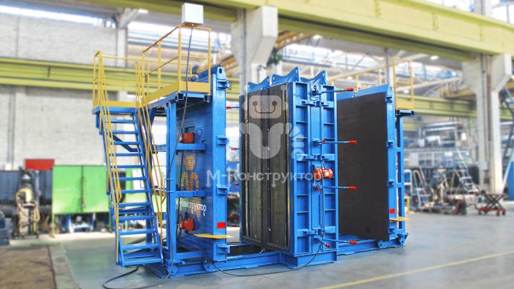 Затем устанавливаются армокаркасы, после чего откатные борта закрываются и фиксируются четырьмя замками. Два из них расположены на высоте, однако доступ к ним обеспечивают угловые площадки обслуживания, поэтому операция выполняется быстро и удобно. По периметру формующей зоны предусмотрен силиконовый уплотнитель, который предотвращает вытекание бетонной смеси и избавляет персонал от лишней очистки оборудования.