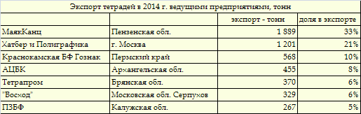 Лидером по экспорту тетрадей в 2014 году выступает ООО «МаякКанц» (Пензенская область). Предприятие увеличило отгрузки тетрадей в Казахстан на 68% и в Киргизию на 15%.