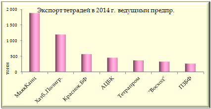 На втором месте в списке ведущих предприятий по экспорту тетрадей в 2014 году стоят два предприятия, расположенные в г. Москва – «Хатберг» и «Полиграфика». Краснокамская бумажная фабрика (филиал Гознака, Пермский край) увеличила поставки в 2014 году в 2,3 раза больше, чем в 2013 году и по объемам экспорта заняла третье место. Существенно выросли поставки тетрадей на рынки Киргизии ведущим производителем школьных тетерадей – Архангельским ЦБК. За 2014 год АЦБК увеличило экспорт тетрадей на 65%. Компания «Тетрапром» (Брянская область) также в 2014 году увеличила экспорт тетрадной продукции – поставки в Казахстан выросли на 70%, в Беларусь было отправлено на треть больше, чем в 2013 году, поставки в Армению выросли на 6%.