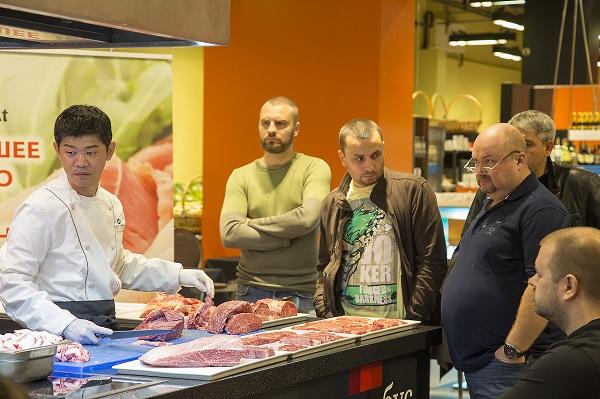 В непринужденной обстановке гости не только наблюдали за процессом разделки мяса, но также пробовали блюда европейской и японской кухни, при создании которых использовалась говядина премиум-класса, предоставленная компанией S.Meat.