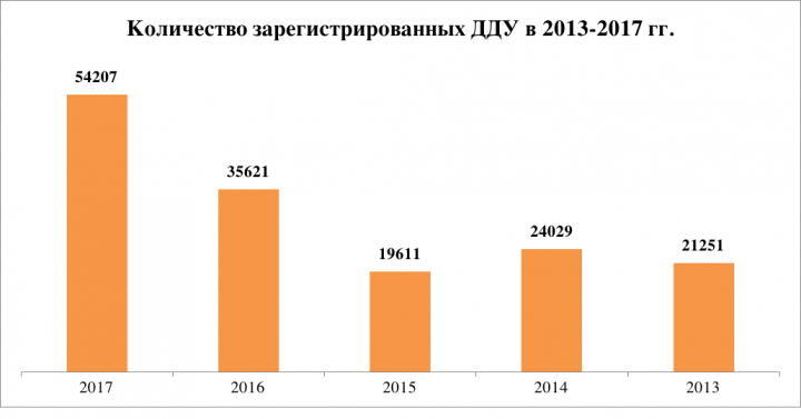 Общее количество сделок на первичном рынке, по данным Росреестра, в 2017 году составило 54 207 ДДУ. Этот показатель на 52,2% превышает данные 2016 года. Более того, он сопоставим с суммарным количеством сделок в новостройках, заключенных в 2015-2016 годах. Тогда объем составил 55 232 ДДУ. Всего же за последние 5 лет в столице было зарегистрировано 154,7 тыс. ДДУ. Таким образом, на прошлый год пришлось 35% всех сделок за «пятилетку».