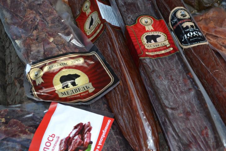 В ассортименте имеются колбасы из мяса медведя, лося, оленя, косули, дикого кабана, куропатки, глухаря и т.д. Все это дичь, побороть и добыть которую могут только профессиональные охотники. Посетителям ярмарки представится уникальная возможность попробовать мясо диких животных, не отправляясь для этого в Сибирь на опасную встречу со зверем.