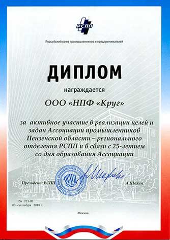 Компания «КРУГ» награждена дипломом за активное участие в реализации целей и задач Ассоциации промышленников Пензенской области и в связи с 25-летием со дня образования Ассоциации.