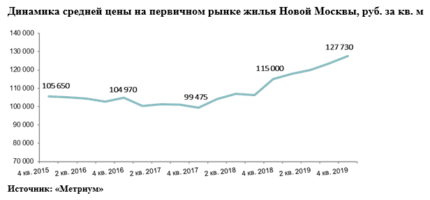 По подсчетам аналитиков «Метриум», в декабре 2019 года средняя цена предложения на первичном рынке жилья Новой Москвы находилась на уровне 127 730 руб. за кв.м, что на 11,1% выше показателя конца прошлого года. Рост цен отмечался на протяжении всего года – от 1,8% до 3,4% в квартал, наибольший скачок зафиксирован в четвертом квартале. В Новомосковском округе средняя цена на рынке новостроек составила в конце года 128 770 руб./кв. м (+8,8%), в Троицком – 67 990 руб./кв. м1 (-0,4%).