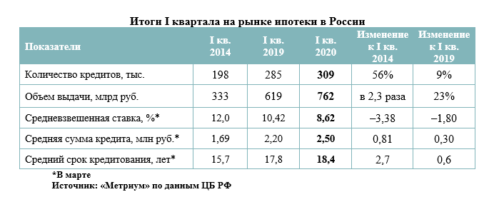 По данным ЦБ РФ, в I квартале 2020 года российские банки выдали 309 тыс. ипотечных кредитов на общую сумму 762 млрд рублей. По сравнению с I кварталом 2019 года число кредитных сделок на рынке жилья увеличилось на 9%, а их объем – на 23%, подсчитали аналитики «Метриум».