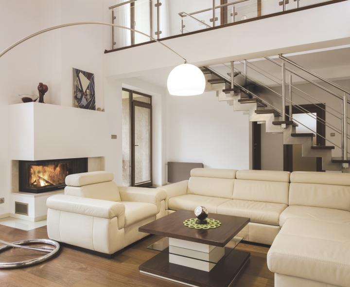 Часто камин автоматически становится «географическим центром» помещения, вокруг него стремятся разместить мягкую мебель, столики, гаджеты. При этом нужно учитывать, что между камином и ближайшими объектами на полу должна выдерживаться дистанция не менее 1,5 м. Особенно это актуально для дровяных каминов. Во-первых, это правильно с точки зрения пожарной безопасности. Во-вторых, тепло от огня очень интенсивно, и со временем оно портит попадающие в зону его действия вещи, особенно кожаные и деревянные.