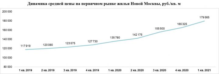 По подсчетам аналитиков «Метриум», к концу I квартала 2021 года средневзвешенная цена на первичном рынке жилья Новой Москвы составила 179 565 руб. за кв. м (+8,6% за квартал; +32,2% за год). Наблюдаемый рост средней цены достаточно равномерен по округам Новой Москвы: квадратный метр в НАО подорожал на 7,9% – до 185 700 руб., в ТАО на 6,7% – до 95 445 руб.