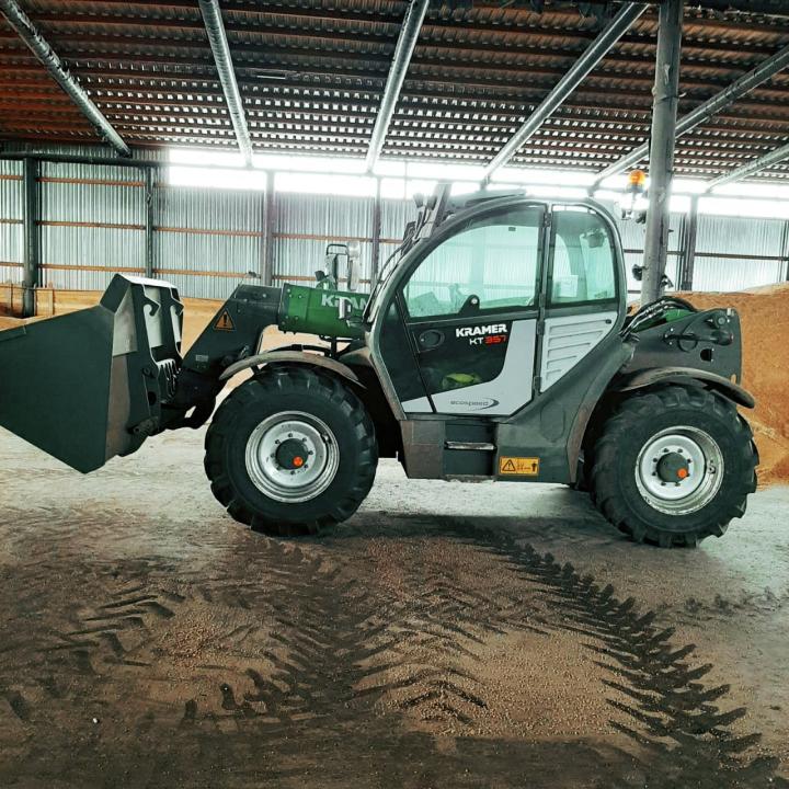 Компания занимается выращиванием картофеля и зерновых. Рост объемов работ и нехватка техники потребовали расширения парка: в пару к уже действующему погрузчику немецкого производства был приобретен Kramer KT357. Он используется для проведения погрузочно-разгрузочных работ, уборки снега, опрокидывания контейнеров, перемещения удобрений, зерна и картофеля. «Принимая решение о покупке, мы сравнивали параметры производительности и литраж разных машин. В итоге остановились на погрузчике Kramer. У него насос выдает 140 литров в минуту, у других «телескопов» — 110–115 литров максимум, для нас это было принципиально», — рассказал Виталий.