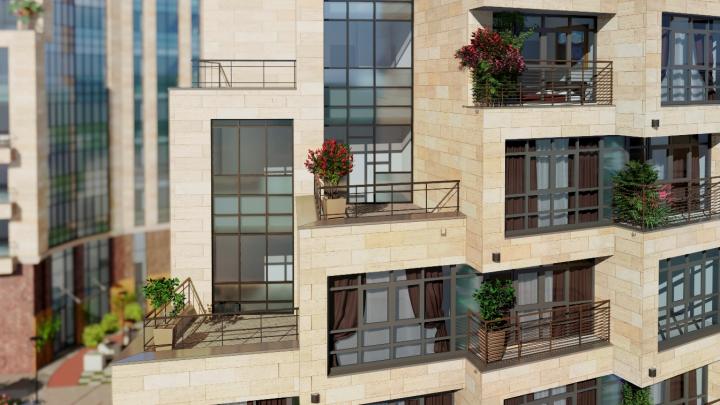 Ступенчатая архитектура и смещение этажей относительно друг друга создают яркий, запоминающийся образ. Современный фасад новостройки сформирован динамично выступающими угловыми объемами. Для отделки будут использованы иранский гранит и светлый травертин. Резидентов встретят роскошные входные группы с потолками 7 метров и дорогой дизайнерской отделкой.
