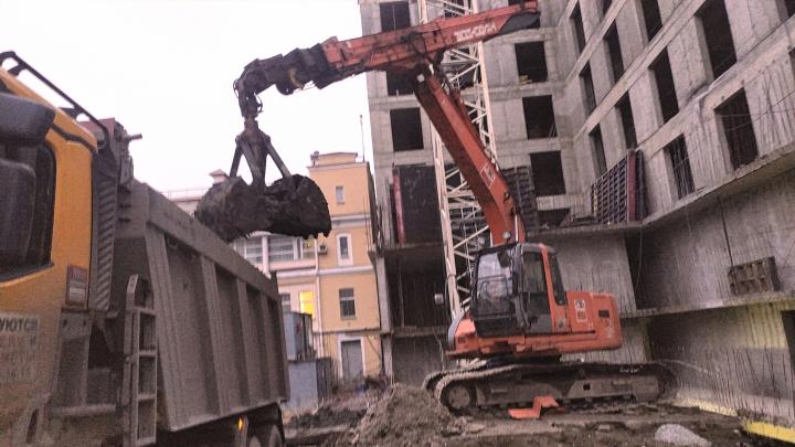 Компания Техоптимум-разработка котлована и вывоз грунта. Cамосвал RENAULT K 440 и экскаватор Hitachi Zaxis 225USRLC с грейфером на телескопической рукояти компании Техоптимум.