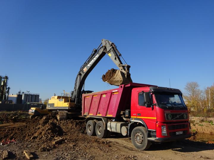 Компания Техоптимум-земляные работы. Экскаватор VOLVO EC 380 DL и самосвал Volvo FM 400 компании Техоптимум.