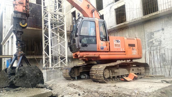 Компания Техоптимум-разработка котлована и вывоз грунта. Экскаватор Hitachi Zaxis 225USRLC с грейфером на телескопической рукояти компании Техоптимум.