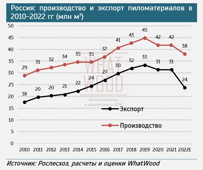 Примечательно, что в 2022 г. темпы снижения экспорта пиломатериалов значительно превзошли темпы сокращения производства. В 2022 г., по предварительным оценкам WhatWood, экспорт сократился на 20% г/г до 23,7 млн м?. Со второго полугодия пиломатериалы из России в Европу не экспортируются. Китай ? главная надежда российских экспортеров ? сократил импорт хвойных пиломатериалов в 2022 г. со всех стран мира, в том числе и из России на 13-15% г/г (-2-2,3 млн м? до 17 млн м?).