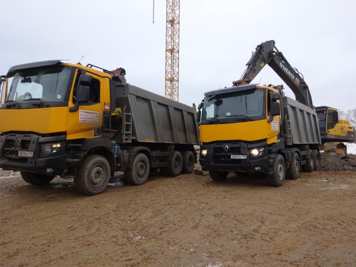 Компания Техоптимум-разработка котлована и вывоз грунта. Cамосвал RENAULT K 440 и экскаватор VOLVO 380 компании Техоптимум.