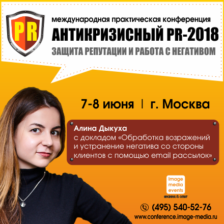 Об этом расскажет креативный директор, координатор проектов сервиса рассылок SendPulse Алина Дыкуха на международной специализированной тематической конференции «АНТИКРИЗИСНЫЙ PR-2018: защита репутации и работа с негативом», которая состоится в Москве 7-8 июня.