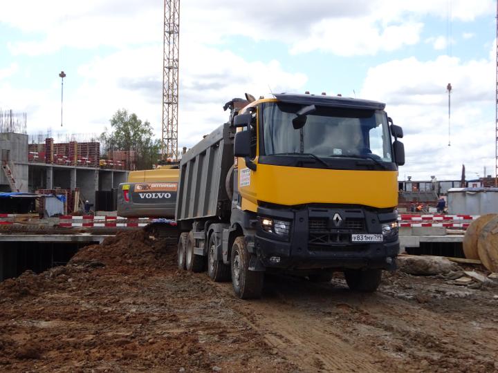 Компания Техоптимум-разработка котлована и вывоз грунта. Cамосвал RENAULT K 440 и экскаватор VOLVO 380 компании Техоптимум.